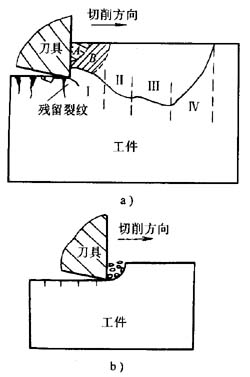 硬脆非金屬材料主要有工程陶瓷、玻璃及石材等。在使用金剛石刀具切削陶瓷時,可以觀察到被切削陶瓷在刀刃擠壓作用下,在刀刃附近產(chǎn)生裂紋,裂紋先向前下方擴(kuò)展,深度超過切削深度,而后一邊前進(jìn)一邊向上方擴(kuò)展,作后穿過工件上部的自由表面,此時形成較大的薄片狀切屑,并在切削表面上留下凹痕(見圖1-8a),這種情況稱之為大規(guī)模擠裂。如果從這種狀態(tài)下繼續(xù)切削,實(shí)際切除的只是崩碎后的殘留部分,這時發(fā)生小規(guī)模擠裂,生成切削表面上較平滑的部分(見圖1-8b)。另外,由于刀刃后方的材料內(nèi)存在拉應(yīng)力,所以在工件已加工表面上可能還會產(chǎn)生與表面大體相垂直的裂紋。在小規(guī)模擠裂發(fā)生以后,刀刃前方的材料就形成與切削表面近似垂直的形狀,切削深度再次變大,切削該部分材料時將再次發(fā)生大規(guī)模擠裂。大規(guī)模擠裂與小規(guī)模擠裂交替進(jìn)行,工件材料就這樣被逐步切開。