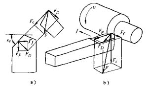 (1) 切削力的產(chǎn)生與切削力的分解 切削加工時,在刀具的作用下,被切削層金屬、切屑和工件已加工表面金屬都要產(chǎn)生彈性變形和塑性變形,這些變形所產(chǎn)生的抗力分別作用在前刀面和后刀面上:同時,由于切屑沿前刀面流出,刀具與工件之間有相對運動,所以還有摩擦力作用在刀面和后刀面上。這些作用在刀具上的合力就是總切削力F,簡稱切削力。