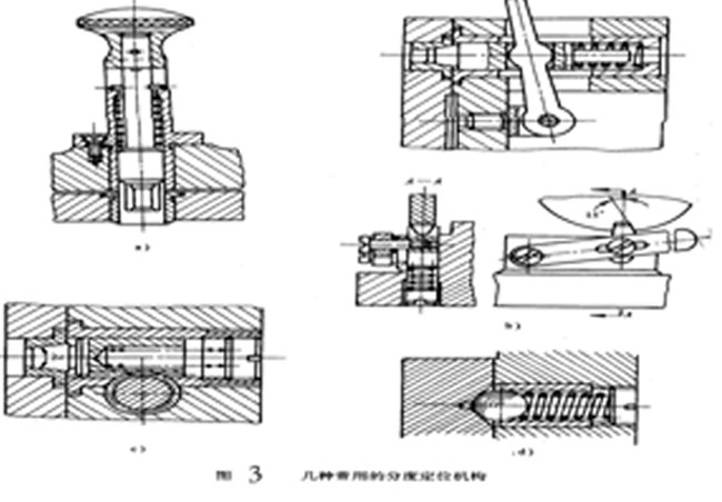 圖3為幾種常用的分度定位機(jī)構(gòu);圖c為齒輪齒條帶動(dòng)分度銷的結(jié)構(gòu);圖d為自動(dòng)退出和復(fù)進(jìn)分度銷,其結(jié)構(gòu)簡(jiǎn)單,操作方便,但分度精度不高,定位也不可靠。