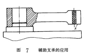 如圖7所示,工件以內(nèi)孔及端面定位,鉆左端小孔。由于左端為一懸臂,鉆也時(shí)工件剛性差。若在A 處設(shè)置固定支承,屬過(guò)定位,有可能破壞左端的定位。這時(shí)可在A 處調(diào)協(xié)一輔助支承,承受眳削力,既不破壞定位,又增加了工件的剛性。