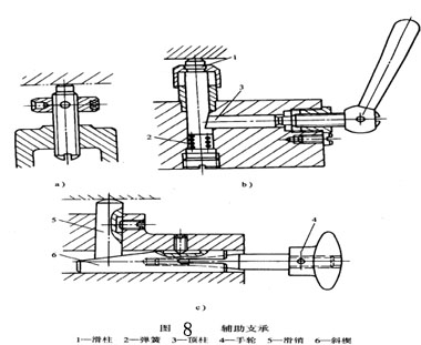 圖8為夾具中的三種輔助支承。圖a為螺旋式輔助支承。圖b為自位式輔助支承,滑柱1在彈簧2的作用下與工件接觸,轉(zhuǎn)動(dòng)手柄使項(xiàng)柱3將滑柱鎖緊。圖c為推引式輔助支承,工件夾緊后轉(zhuǎn)動(dòng)手輪4使斜楔6左移將滑銷5與工件接觸。繼續(xù)轉(zhuǎn)動(dòng)手輪可使斜楔的6的開槽部分漲開面緊鎖。