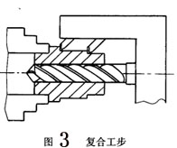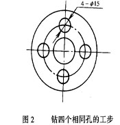 如圖2所示零件,連續(xù)鉆四φ15mm的孔,可看作一個(gè)工步鉆4孔φ15mm,以簡化工藝文件,另一種情況,有時(shí)為了提高生產(chǎn)率,用向把不同刀具,同時(shí)加工幾個(gè)不同表面,如圖3,也可看作一個(gè)工步,稱為復(fù)合工步。