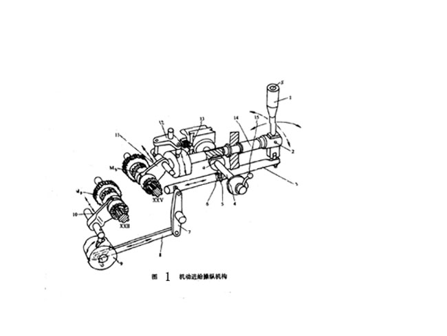 1、 縱向、橫向機動進給及快速移動是由一個手柄集中操縱圖1,當需要縱向移動刀架時,向相應(yīng)方向(向左或向右)扳動手柄1.而操縱手柄1只能繞銷1擺動,于是手柄1下部的開口槽就撥動軸3軸向移動。軸3通過杠桿及7及扒桿8使鼓形凸輪9轉(zhuǎn)動,凸輪9的曲線槽迫使撥叉10移動,從而操縱軸ⅩⅩⅡ上的牙嵌式雙向離合器M8向相應(yīng)方向嚙合。這時如光杠軸號ⅩⅩⅡ轉(zhuǎn)動,運動傳給軸ⅩⅩ,從而使刀架作縱向機動進給;如按下手柄1上端的快速移動按鈕s快速電動機起動,刀架就可向相應(yīng)方向快速移動,直到松開快速移動按鈕時為止。如向前或向后扳動操縱手柄1,可通過軸14使鼓形凸輪13轉(zhuǎn)動,凸輪13上的曲線槽迫使杠桿12擺動,杠桿12又通過拔叉11撥動軸ⅩⅩⅡ上的牙嵌式雙向離合器M9向相應(yīng)向方嚙合。這時,如接通光杠或快速電動機就可使橫刀架實現(xiàn)向前或向后的橫向機動進給或快速移動.操給手柄1處于中間位置時,離合器M8和M9脫開,這時機動進給及快速移動均被斷開。