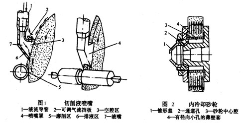 5) 改善切削液供給方式。高速磨削時,磨削溫度極高,面砂輪周圍高速回轉(zhuǎn)形成一股強大的氣流,切削液不易注入磨削區(qū),為避免工件表面燒傷,應(yīng)增加切削液的流量和壓力,并采用特殊噴嘴,如圖1所示,另外還可采用多孔性砂輪,冷卻液不是直執(zhí)著注入磨削區(qū),而是從砂輪內(nèi)部在離心力作用下送入磨削區(qū),如圖2
