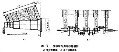 寬砂輪與多片砂輪磨削,都是增加砂輪寬度的磨削方法,適用于加工階梯軸、曲軸、凸輪軸、螺紋、錐等工件。圖3a、2b分別表示其加工方法。