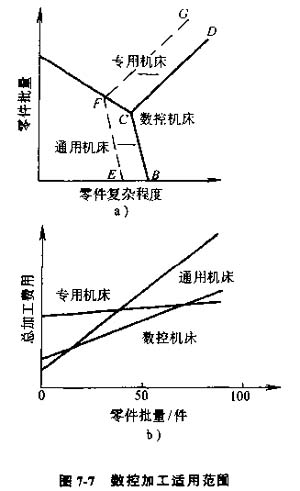 圖7-7所示為零件復雜及生產(chǎn)批量的不同,三種機床的應用范圍的變化,當零件不太復雜,生產(chǎn)批量又較小時,宜采用通用機床;當生產(chǎn)批量很大,宜采用專用機床;而隨著零件復雜程度的提高,數(shù)控機床越顯得適用。目前,隨著數(shù)控機床的普及,應用范圍止由BCD向EFG線復雜性較低的范圍擴大。