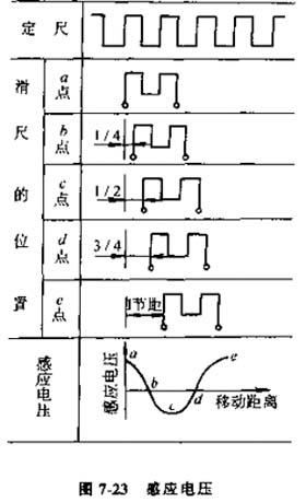 圖7-23所示為滑尺在不同位置時(shí)定尺上的感應(yīng)電壓,當(dāng)定尺與滑尺繞組重合時(shí),如圖中a點(diǎn),這時(shí)感應(yīng)電壓最大。當(dāng)滑尺相對(duì)于定尺平行移動(dòng)后,感應(yīng)電壓便逐漸減小,在錯(cuò)開(kāi)1/4節(jié)距的b點(diǎn)時(shí)感應(yīng)電壓為零。再繼續(xù)移動(dòng)到1/2節(jié)距的c點(diǎn)時(shí),得到的電壓值與a點(diǎn)位置相同,但極性相反,隨后感應(yīng)電壓在3/4節(jié)距位置d點(diǎn)時(shí)又變?yōu)榱悖谝苿?dòng)一個(gè)節(jié)距到e點(diǎn)時(shí),電壓幅值與a點(diǎn)位置相同。這樣滑尺在移動(dòng)一個(gè)節(jié)距的過(guò)程中,感應(yīng)電壓變化了一個(gè)余弦波形。由此可見(jiàn),在激磁繞組中加上一定的交變激磁電壓,感應(yīng)繞組中就產(chǎn)生相同頻率的感應(yīng)電壓,其幅值大小隨著滑尺移動(dòng)作余弦規(guī)律變化。滑尺移動(dòng)一個(gè)節(jié)距,感應(yīng)電壓變化一個(gè)周期,感應(yīng)同步器就是利用這個(gè)個(gè)感應(yīng)電壓的變化來(lái)進(jìn)行位置檢測(cè)的