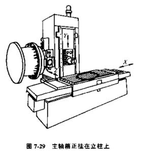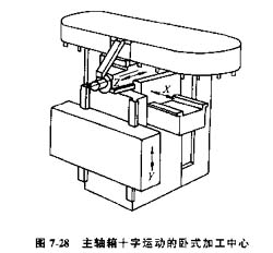 2)主軸箱十字運(yùn)動(dòng),主軸箱作X、Z向運(yùn)動(dòng),工作臺(tái)作Y向運(yùn)動(dòng)(圖7-28)所示。適用于中小型零件的鏜、銑等多工序加工。