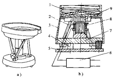(1) 振動式料斗的運動特點圖60-1的振動式料斗由電磁力作為驅(qū)動力。當(dāng)電磁達(dá)到最大值時,街鐵9被吸下,帶動料斗1,同時三片沿圓周方向分布的彈簧2變形。電磁力消失時街鐵放開,彈簧復(fù)原。彈簧的變形,復(fù)原過程中,料斗1既作上下運動,又作扭轉(zhuǎn)運動,使零件從低部沿螺旋軌道上升,在料斗內(nèi)座上布置的定向裝置對零件作定向整理。正確定向的零件從料斗上部的出料口進(jìn)入輸聊管道。