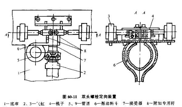 圖60-11中雙頭螺栓從振動(dòng)料斗6沿管道9前進(jìn)。在此雙頭螺栓之前,另有一個(gè)雙頭螺栓從振動(dòng)料斗進(jìn)入氣缸2推動(dòng)的供料接受器7,前一螺栓被后一螺栓的桿身或由接受器7的附加轉(zhuǎn)用桿隔離。移動(dòng)的雙頭螺栓由兩個(gè)彈簧作用的梳子供料。氣缸2在前面位置停下來(lái)后,氣缸3接通,將梳子4向兩個(gè)不同方向分開。一對(duì)梳子均帶有齒頂不尖的雙頭螺栓,其中一個(gè)梳子處于同雙有螺栓的螺紋嚙和狀態(tài),另一個(gè)梳子沿著螺距較小的螺紋梳子面滑動(dòng)。移動(dòng)時(shí),雙頭螺栓將滑入底座1的橢圓窗孔并沿著接受槽(即管道5)進(jìn)入螺栓搬運(yùn)器,在進(jìn)入旋緊螺栓的工作機(jī)構(gòu)。第二個(gè)梳子由于螺距不同,不能與雙頭螺栓端部螺紋嚙合,因而停留在螺紋表面上。作為例外(當(dāng)螺栓直徑和質(zhì)量較大時(shí)),梳子螺紋和螺栓螺紋相同,但可能與螺栓不重合。但當(dāng)油缸活塞桿開始運(yùn)動(dòng)時(shí),梳子就一定能與螺栓螺紋想嚙合。當(dāng)螺栓進(jìn)入梳子面下時(shí),雙頭螺栓在梳子牙條傾斜角作用下轉(zhuǎn)動(dòng),因此牙條與雙頭螺栓相嚙合始終不少于三個(gè)牙;而另一雙頭螺栓不進(jìn)行嚙合。