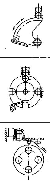 帶溝槽的圓盤(pán)間歇轉(zhuǎn)動(dòng),當(dāng)盤(pán)回轉(zhuǎn)時(shí),零件輪流入盤(pán)上的凹槽中,在隨這盤(pán)的轉(zhuǎn)動(dòng)進(jìn)入工作區(qū) |