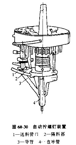 (1)導(dǎo)管式螺釘自動(dòng)裝配工作頭,這種工作頭通過(guò)導(dǎo)管來(lái)引導(dǎo)已定向的螺釘按正確的姿態(tài)進(jìn)入裝配位置。圖60-30為一種擰緊器與供料裝置為一體的自動(dòng)擰緊螺釘裝置。螺釘在送料管口1處被隔料器2擋住,主軸帶動(dòng)改錐將螺釘擰入工件后,該錐上抬,隔料器2放下一個(gè)螺釘使之沿導(dǎo)管3進(jìn)入直導(dǎo)管4,進(jìn)入新的循環(huán)。