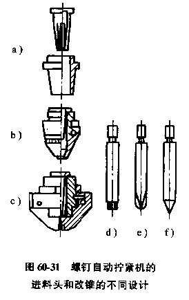 進(jìn)料頭需要根據(jù)螺釘尺寸和螺釘裝配要求設(shè)計(jì)。圖60-31為幾種不同類型的進(jìn)料頭和旋具。圖60-31a中的進(jìn)料頭適用于長(zhǎng)徑比大于5的螺釘,進(jìn)料頭帶有一個(gè)錐形彈性鉗,內(nèi)錐通過(guò)主軸上的套筒實(shí)現(xiàn)定心。圖60-31b和圖60-31c適用于短螺釘,這兩種進(jìn)料頭別有鉸鏈?zhǔn)姐Q臂裝在軸上,關(guān)閉時(shí)形成一個(gè)螺釘直徑大小的孔,進(jìn)料時(shí)進(jìn)料頭與孔的上端接觸,在擰人螺釘?shù)倪^(guò)程中,鉸鏈臂通過(guò)旋具的設(shè)計(jì)可根據(jù)螺釘頭取相應(yīng)的結(jié)構(gòu),如六角形、十字形成或帶槽的旋具。