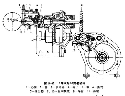卡環(huán)的成形機(jī)構(gòu)及向活塞槽安裝卡環(huán)的機(jī)構(gòu),圖60-63所示機(jī)構(gòu)的主要元件是柱形心軸1、不轉(zhuǎn)動(dòng)的套2、推出器7和輥?zhàn)?。心軸1上開(kāi)有徑向槽,可以旋轉(zhuǎn),形狀為徑向槽開(kāi)始并沿其回轉(zhuǎn)進(jìn)程直徑逐漸變小的錐體。套2與心軸同軸并形成一個(gè)環(huán)形間隙,當(dāng)卡環(huán)毛坯一端被卡在心軸的徑向槽中時(shí),在環(huán)形間隙中加工出卡環(huán)的毛坯。套形推出器的外徑等于活塞上孔的直徑,安裝在環(huán)形間隙中并與心軸用鍵聯(lián)接,同時(shí)與帶軸向移動(dòng)和轉(zhuǎn)動(dòng)的驅(qū)動(dòng)裝置10和8相連。輥?zhàn)?位于把卡環(huán)3壓向心軸軸線的軸上,并通過(guò)傳動(dòng)比為1的齒輪6與心軸相連接。輥?zhàn)拥耐庑沃鸩皆龃蟆?/DIV>
