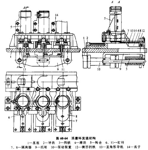 向滑塊上自動(dòng)發(fā)送活塞環(huán)的機(jī)構(gòu),圖60-64機(jī)構(gòu)有一個(gè)基座上緊固著逐個(gè)發(fā)送活塞環(huán)的料倉(cāng)5和杠桿6,在垂直于料倉(cāng)中心線的平面內(nèi)鉸接并用彈簧相互拉緊,還帶有形狀與被夾持的活塞環(huán)相似的輥?zhàn)鱼Q口,以及在料倉(cāng)下垂直其中心線的并在平面內(nèi)能移動(dòng)的隔離器7和8推板做成托架9的形式,并帶有強(qiáng)制性驅(qū)動(dòng)裝置10,推板沿導(dǎo)軌2移動(dòng),用杠桿11與滑塊4相互作用,滑塊上固定隔離器7和8以及楔形擋鐵12,在滑塊工作行程末端與彈簧杠桿6相互作用;瑝K連同不動(dòng)的固定隔離器可以在固定于基座上的直角形導(dǎo)軌13內(nèi)移動(dòng)。隔離器上面用蓋子14蓋住,靜止地架在直角形導(dǎo)軌13上面