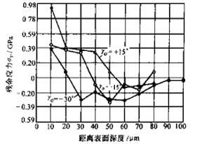 1) 刀具方面,當前角由正值逐漸變?yōu)樨撝禃r,表層的殘余拉應力逐漸減小,但殘余應力層的深度增大(見圖3-5)在一定的切削用量下,采用絕對值較大的負前角,可使已加工表面層得到殘余壓應力(見圖3-6)