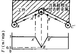在輪廓加工中,應(yīng)注意克服由于慣性或伺服系統(tǒng)的隨動誤差而造成輪廓拐角處的“超程”或“欠程”現(xiàn)象。為此,要選擇變化的進(jìn)給量,即在接近拐角處應(yīng)適當(dāng)降低進(jìn)給量,過拐角后在逐漸升高,以保證加工精度(見圖4-5)。