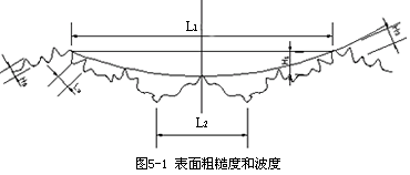 加工表面的微觀幾何特征主要包括表面粗糙度和表面波度兩部分組成,如圖 5— 1所示。表面粗糙度是波距 L小于 1mm的表面微小波紋;表面波度是指波距 L在 1~ 20mm之間的表面波紋。通常情況下,當 L/H(波距 /波高)﹤ 50時為表面粗糙度, L/H=50~ 1000時為表面波度。