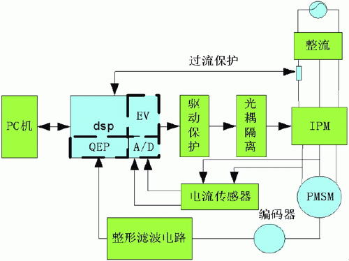 交流伺服數(shù)字化系統(tǒng)的硬件由DSP作為信號(hào)處理器,用旋轉(zhuǎn)編碼器和電流傳感器提供反饋信號(hào),智能功率模塊IPM作為逆變器,經(jīng)傳感器出來(lái)的信號(hào)經(jīng)過(guò)濾波整形等處理后反饋給DSP進(jìn)行運(yùn)算,DSP經(jīng)過(guò)對(duì)參考信號(hào)和反饋信號(hào)的處理運(yùn)算來(lái)調(diào)節(jié)伺服系統(tǒng)的電流環(huán),速度環(huán),和位置環(huán)的控制,最后輸出PWM信號(hào)經(jīng)過(guò)隔離驅(qū)動(dòng)IPM模塊實(shí)現(xiàn)電機(jī)的伺服閉環(huán)控制。 系統(tǒng)的硬件結(jié)構(gòu)如圖1所示。