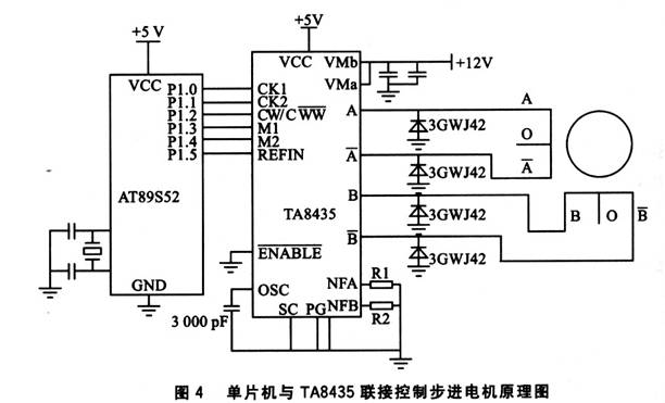 圖4是單片機(jī)與TA8435相連控制步進(jìn)電機(jī)的原理圖。引腳M1和M2決定電機(jī)的轉(zhuǎn)動(dòng)方式:MI=0、M2=O,電機(jī)按整步方式運(yùn)轉(zhuǎn);Ml=1、M2=0,電機(jī)按半步方式運(yùn)轉(zhuǎn);M1=O、M2=1,電機(jī)按1/4細(xì)分方式運(yùn)轉(zhuǎn);Ml=1、M2=1,電機(jī)按l/8步細(xì)分方式運(yùn)轉(zhuǎn)。CW/CWW控制電機(jī)轉(zhuǎn)動(dòng)方向,CKl、CK2時(shí)鐘輸入的最大頻率不能超過(guò)5 kHz。控制時(shí)鐘的頻率,即可控制電機(jī)轉(zhuǎn)動(dòng)速率。REFIN為高電平時(shí),NFA和NFB的輸出電壓為0.8 V,REFIN為低電平時(shí),NFA和NFB輸出電壓為0.5 V,這2個(gè)引腳控制步進(jìn)電機(jī)輸入電流,電流大小與NF端外接電阻關(guān)系式為:,Io=Vref/Rnf。圖4中,設(shè)REFIN=l,選用步進(jìn)電機(jī)額定電流為0.4 A,Rl、R2選用1.6 Ω、2W的大功率電阻,O、C兩線不接。步進(jìn)電機(jī)按二相雙極性使用,四相按二相使用時(shí)可以提高步進(jìn)電機(jī)的輸出轉(zhuǎn)矩。D1~D4快恢復(fù)二極管用來(lái)泄放繞組電流。