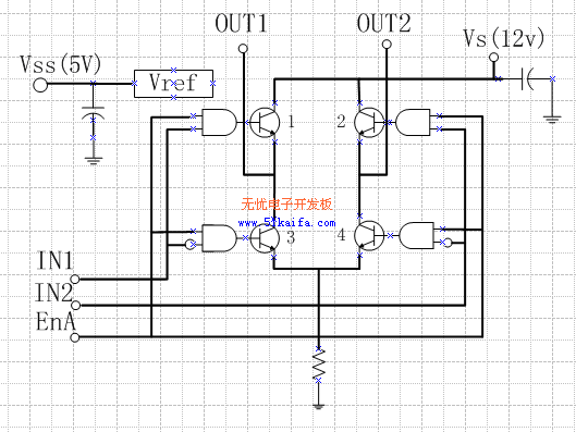 另一個H橋的工作原理同上。由EnB控制OUT3和OUT4之間電機(jī)的停轉(zhuǎn),根據(jù)IN3、IN4腳的輸入電平情況控制OUT3和OUT4之間電機(jī)的轉(zhuǎn)向。