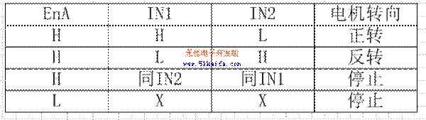 為提高系統(tǒng)效率、降低功耗,功放驅(qū)動電路采用基于雙極型H橋型脈寬調(diào)制方式(PWM)的集成電路L298N。L298N是SGS公司的產(chǎn)品,內(nèi)部包含二個H橋的高電壓大電流橋式驅(qū)動器,接收標(biāo)準(zhǔn)TTL邏輯電平信號,可驅(qū)動46伏、2安培以下的電機(jī),工作溫度范圍從-25度到130度。其內(nèi)部的一個H橋原理圖如圖1所示。EnA是控制使能端,控制OUTl和OUT2之間電機(jī)的停轉(zhuǎn), IN1、IN2腳接入控制電平,控制OUTl和OUT2之間電機(jī)的轉(zhuǎn)向。當(dāng)使能端EnA有效,IN1為低電平IN2為高電平時,三極管2,3導(dǎo)通,1,4截止,電機(jī)反轉(zhuǎn)。當(dāng)IN1和IN2電平相同時,電機(jī)停轉(zhuǎn)。表1是其使能引腳,輸入引腳和輸出引腳之間的邏輯關(guān)系。