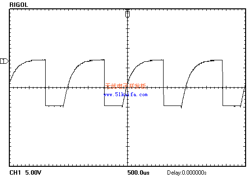 圖4是由示波器產(chǎn)生的PWM頻率為1KHz,占空比80%,電機(jī)正轉(zhuǎn)時的調(diào)制波形。