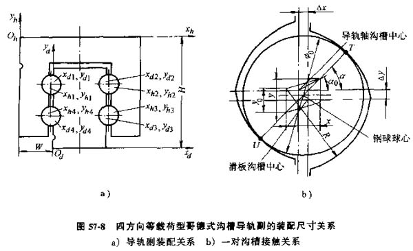 圖57-8a為哥德式直線(xiàn)滾動(dòng)導(dǎo)軌副的裝配關(guān)系,圖57-8b為一對(duì)溝槽的鋼球接觸關(guān)系。該導(dǎo)軌副有四對(duì)溝槽,滑板與導(dǎo)軌軸各對(duì)溝槽的設(shè)計(jì)中心并不在同一點(diǎn),分別位于圖57-8a中的Xhi,Yhi和Xdi,Ydi(i=1,2,3,4),h表示滑板,d表示導(dǎo)軌軸。裝配后鋼球在溝槽中的過(guò)盈量是主要的裝配精度要求之一。