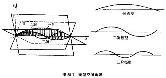 (1)撓性轉(zhuǎn)子動(dòng)平衡原理,將撓性轉(zhuǎn)子簡(jiǎn)化為一根簡(jiǎn)支梁,梁在其彈性穩(wěn)定平衡位置附近會(huì)發(fā)生多種形式的微小振動(dòng),其中橫向振動(dòng)是撓性轉(zhuǎn)子動(dòng)平衡的理論基礎(chǔ),整個(gè)轉(zhuǎn)子的振動(dòng)位移,即動(dòng)撓度曲線上一條繞如圖58-7所示的轉(zhuǎn)軸Oz,以角速度w回轉(zhuǎn)的空間曲線,可以視該曲線為無(wú)限多條固有頻率不同的振型曲線在空間疊加而成。各階振型曲線所在平面互不重合,圖58-7所示為三個(gè)振型的空間曲線。
