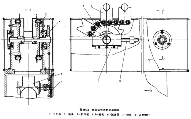 如圖50-56所式,它由兩列封閉式鏈條、鏈輪和驅(qū)動裝置所組成。用于支承工件及定位的V形板1,等距地固定在鏈條2的削軸上,隨同鏈條一起運動。鏈條由電動機通過減速器6和鏈輪5、4傳動,為了防止鏈條下垂,每個環(huán)節(jié)側(cè)面的滾子支承在導(dǎo)板3上,在減速器軸端裝有電磁離合器。用來實現(xiàn)鏈條的準(zhǔn)確停止。鏈條的松緊可以通過螺釘8和滑塊7調(diào)節(jié)。