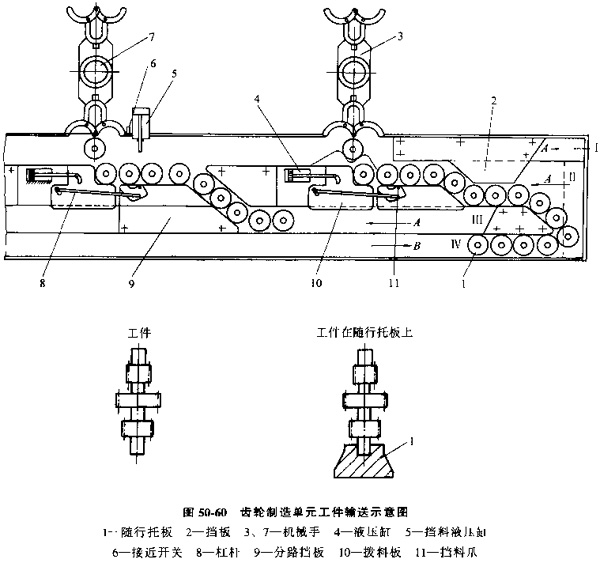 圖50-60是由鏈板履帶傳送機組成的齒輪加工單元,工件安裝在隨行托板中,在鏈板履帶上輸送,箭頭A表示工件傳送方向,工件從通道Ⅰ輸入,經(jīng)分路擋板2分成兩路。一路沿通道Ⅱ進(jìn)入第一臺滾齒機貯料區(qū),另一路沿通道Ⅲ經(jīng)分路擋板9進(jìn)入第二臺滾齒機貯料區(qū)。上料時,液壓缸4動作,通過杠桿機構(gòu)8使撥料板10及擋料爪11動作,撥料塊將工件撥至機械手3前,擋料爪則將通道Ⅱ繼續(xù)送來的工件擋住,加工好的工件由通道Ⅰ輸出。