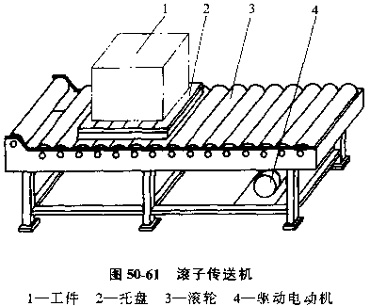 滾子傳送機是由一根根平行的轉(zhuǎn)軸。及轉(zhuǎn)軸上套的滾輪,鏈輪(或齒輪)及驅(qū)動裝置組成的。見圖50-61/滾輪安裝成等高,靠滾動摩擦力傳送工件。