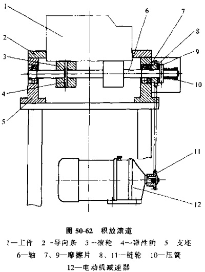 當(dāng)轉(zhuǎn)軸與鏈輪、滾輪均采用剛性聯(lián)接時,傳送機屬于強制滾輪,即不論工件處于什么狀態(tài),在電動機運轉(zhuǎn)情況下,滾輪始終勻速轉(zhuǎn)動,此時如果工件被擋料器阻擋停下,滾輪與工件輸送面之間的滾動摩擦變?yōu)榛瑒幽Σ,會加大輸送面的磨損,這時對一些材質(zhì)較軟。用已精加工面作輸送面,或?qū)斔兔婢纫蟾叩墓ぜ螂S行夾具來說是不利的,因此,現(xiàn)在多采用積放式滾子傳送機,也就是滾輪與轉(zhuǎn)軸之間,或轉(zhuǎn)軸與鏈輪之間,不采用剛性聯(lián)接,而是靠摩擦傳動,見圖50-62。當(dāng)正常輸送時,驅(qū)動力通過鏈條、鏈輪、滾輪、驅(qū)動工件,工件與滾輪間為純滾動,當(dāng)工件被擋住時,滾輪與轉(zhuǎn)軸或轉(zhuǎn)軸與鏈輪之間的摩擦力小于工件與滾輪間的靜摩擦,工件與滾輪保持靜止,而滾輪與轉(zhuǎn)軸,或轉(zhuǎn)軸與鏈輪之間相對打滑,從而減少了對工件輸送面的磨損。采用滾輪與轉(zhuǎn)軸相對摩擦傳動的方式,結(jié)構(gòu)相對簡單。但滾輪與轉(zhuǎn)軸間磨損較快,對輸送精度和維修更換不利。采用鏈輪端面摩擦方式,可以通過彈簧調(diào)整摩擦力。較少摩擦片磨損的影響。維修更換都比較方便,但軸向尺寸需要加大。