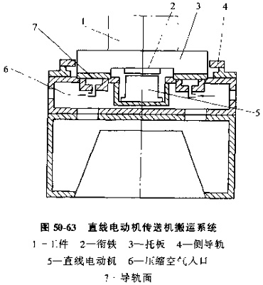 圖50-63是用于組成柔性制造系統(tǒng)的直線電動機傳送機,在這一輸送系統(tǒng)中,托盤在空氣靜壓導(dǎo)軌上運行,直線電動機設(shè)置在中部,銜鐵設(shè)置在托板下方。