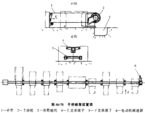 平帶輸屑裝置(見圖50-78)在自動(dòng)線的縱向,用寬型平帶1貫穿機(jī)床中部的下方,平帶張緊在鼓形輪之間,切屑落在平帶上后,被帶到容屑坑3中定期清除。