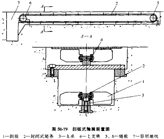 刮板式輸屑裝置(見表50-79)該裝置也是沿縱向貫穿自動(dòng)線鋪設(shè),她可以設(shè)在自動(dòng)線機(jī)床中間底座內(nèi)或自動(dòng)線下方地溝里。封閉式鏈條2裝在兩個(gè)鏈輪5和6上,焊在鏈條兩側(cè)的刮板1將地溝中的切屑刮到深坑7中,再用提升器將切屑提起倒入小車中運(yùn)走。