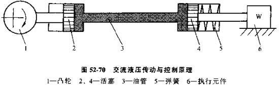 在這種控制系統(tǒng)中,凸輪1推動活塞2移動,活塞2又迫使油管3中的油液流動,從而推動活塞4和執(zhí)行機構(gòu)6移動,返回時靠彈簧5的彈力使整個系統(tǒng)回原位。執(zhí)行機構(gòu)的運動規(guī)律。由凸輪1控制。凸輪1是指令存儲裝置,同時又是驅(qū)動元件,由于在這種系統(tǒng)中,工作油液是在密封的管路中往復流動,故稱為交流液壓傳動。