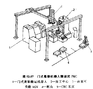 2) 龍門式機器人直接搬運的FMC(見圖52-57)其特點是,可搬運較大較重的零件和其他物料,搬運設(shè)備不占場地。