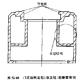A,門式結(jié)構(gòu)的雙立柱,為了減少機械熱變形,中小型的加工中心外形通常采用左右對稱的門式結(jié)構(gòu)立柱,見圖52-60。這種立柱大多采用雙壁結(jié)構(gòu),主軸頭在立柱內(nèi)上下運動。