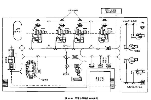 (2)帶流動刀庫的FMS(見圖52-61)此系統(tǒng)的特點之一是,系統(tǒng)內(nèi)設(shè)有可更換的流動刀庫,流動刀庫根據(jù)加工的需要在其裝卸站配備刀具,由小車AGV運送并暫存在流動刀庫緩存站,加工需要時送到機床邊的刀具交換站,與機床刀庫中的刀具更換。