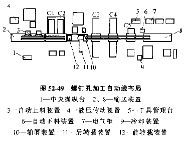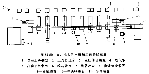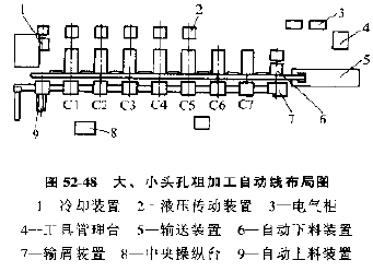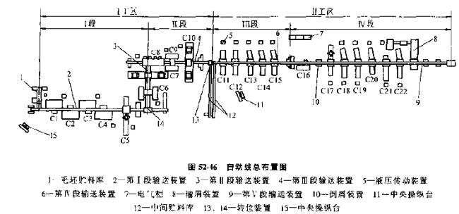 自動(dòng)線總布局見(jiàn)圖52-48,圖52-49、圖52-50,三條自動(dòng)線由20臺(tái)機(jī)床組成,每條自動(dòng)線都有單獨(dú)的自動(dòng)上下料裝置。