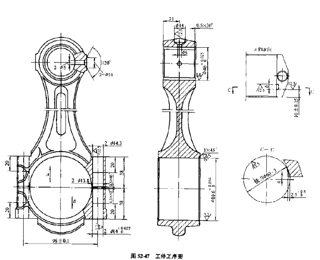 該自動(dòng)線用于連桿大,小頭孔粗加工,半精加工及螺釘孔加工,加工工件見(jiàn)圖52-47,工件材質(zhì)為45鋼。