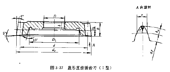 GB6081—85《直齒插齒刀的基本型式和尺寸》中規(guī)定了模數(shù)1~12mm,分度圓壓力角為20°的盤形直齒插齒刀(Ⅰ型)、碗形直齒插齒刀(Ⅱ型)和錐柄直齒插齒刀(Ⅲ型)三種。盤形直齒插齒刀主要用于加工外齒輪和大直徑的內齒輪,以及齒條等,其公稱分度圓直徑有75,100,125,160和200mm五種,精度等級分AA、A、B三種,盤形直齒插齒刀的型式和尺寸見圖3-37和表3-72~表3-77、表3-85~表3-90。