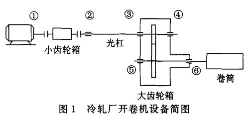 2.1 冷軋廠開(kāi)卷機(jī)設(shè)備簡(jiǎn)圖及主要技術(shù)參數(shù)冷軋廠開(kāi)卷機(jī)設(shè)備的簡(jiǎn)圖見(jiàn)圖1,其主要技術(shù)參數(shù):電動(dòng)機(jī)轉(zhuǎn)速為1 280 r/min;齒輪均為斜齒輪;聯(lián)軸器為齒式聯(lián)軸器。圖中的②一⑥點(diǎn)軸承均為心滾子軸承。