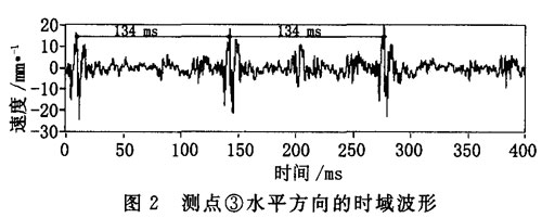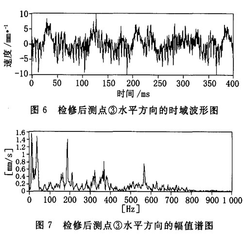 更換新齒輪后,再次進(jìn)行測(cè)量,測(cè)點(diǎn)③的水平方向的速度幅值從3.9 mm/s降到2.9 mm/s,加速度幅值從107. 3 m/s降到6.2 m/s,峭度指標(biāo)從原來(lái)的20. 2降到3. 17。說(shuō)明該機(jī)已正常運(yùn)行。