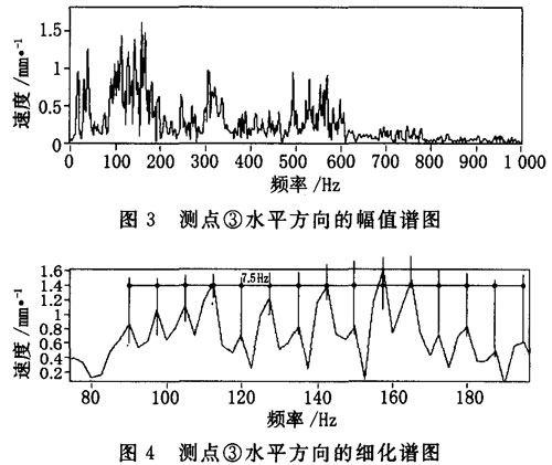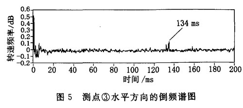 2004年以來(lái),開(kāi)卷機(jī)的振動(dòng)增大,為此進(jìn)行振動(dòng)測(cè)試,共測(cè)試了②,③,④,⑤共4個(gè)測(cè)點(diǎn),其中③測(cè)點(diǎn)的水平方向速度振值顯著,加速度振值達(dá)107. 30 m/s,已是標(biāo)準(zhǔn)值的3倍多(標(biāo)準(zhǔn)值為30m/s ) ,峭度指標(biāo)為20. 2,這預(yù)示齒輪箱在測(cè)點(diǎn)③附近存在故障。在測(cè)點(diǎn)③水平方向的時(shí)域波形圖(圖2)中清晰地顯示出每轉(zhuǎn)一周都出現(xiàn)一個(gè)脈沖信號(hào),脈沖間隔為134 ms,頻率值7.5 Hz。這恰與大齒輪箱高速軸(小齒輪所在軸)轉(zhuǎn)速頻率一致。測(cè)點(diǎn)③水平方向頻譜圖(圖3)上,由于故障信號(hào)的影響調(diào)制出大量的邊頻,譜線密集難以辨認(rèn),故取80一200 Hz頻段細(xì)化處理(圖4)。為了進(jìn)一步驗(yàn)證結(jié)論,又進(jìn)行了該點(diǎn)的倒頻譜分析(圖5),從倒頻譜圖上更清楚地看到主要的頻率成分,其倒頻率為134 ms(即7. 5 Hz),正好對(duì)應(yīng)大齒輪箱高速軸的轉(zhuǎn)速頻率。