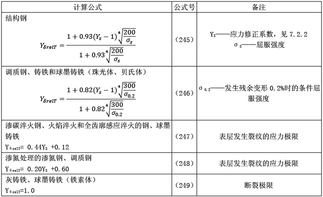 靜強度的YδrelT值可按表31中的相應公式計算得出(當應力修正系數在1.5<YS<3的范圍內時,靜強度的相對敏感系數YδrelT近似地可取為:YS/YST;但此近似數不能用于氮化的調質鋼與灰鑄鐵)。
