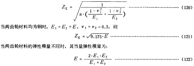 彈性系數(shù)ZE是用以考慮材料彈性模量E泊桑比v對赫茲應力的影響。其數(shù)值可按實際的材料彈性模量E和泊桑比v由式(120)計算得出。對于某些常用材料組合的ZE可參考表14查取。