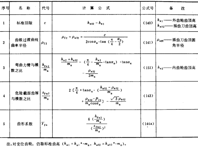 內(nèi)齒輪的齒形系數(shù)YF不僅與齒數(shù)和變位系數(shù)有關(guān),且與插齒刀的參數(shù)有關(guān)。為了簡化計算,可近似按替代齒條計算(見圖27)。替代齒條的法向齒廓與基本齒條相假,齒高與內(nèi)齒輪相同,法向載荷作用角αFen等于αn,并以腳標2表示內(nèi)齒輪。有關(guān)計算公式見表16(適用于Z2>70)。