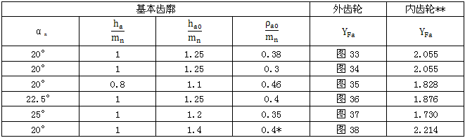 與圖33至38各齒形參數(shù)相對應的內(nèi)齒輪齒形系數(shù)YFa也可由表19查取。